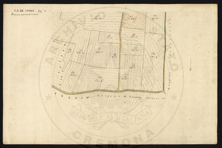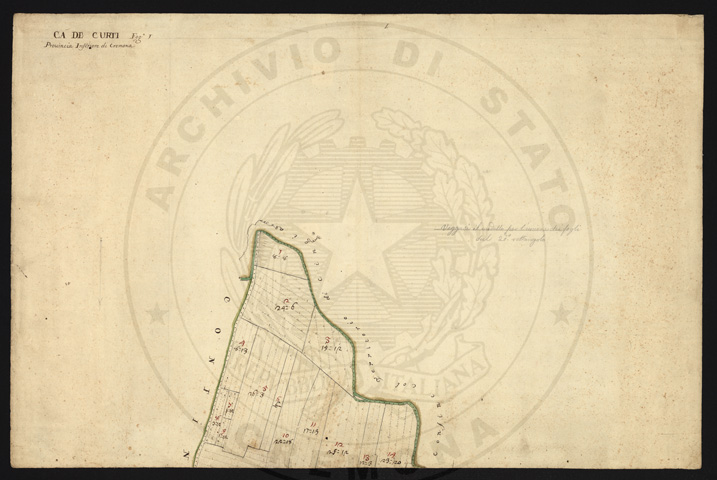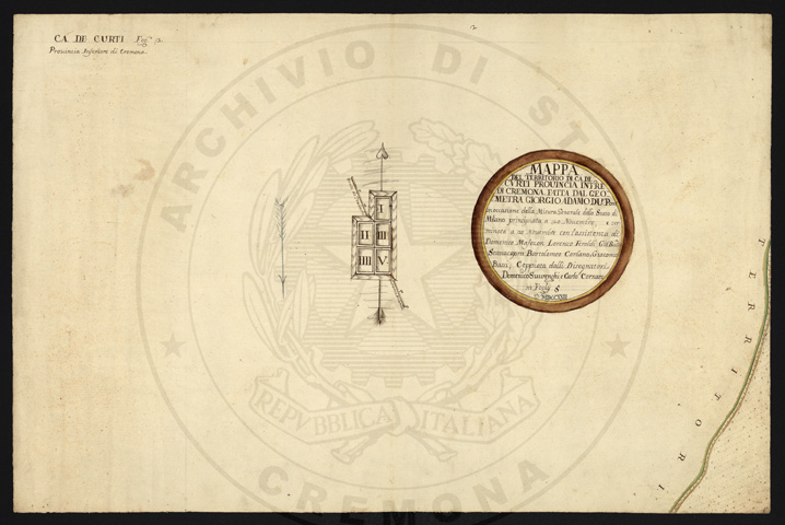 Mandamento: CremonaComune: Ca' de' CortiSegnatura: 016Fogli: 5Anno: 1722Misuratore: Giorgio Adamo DupontAssistenti: Domenico Maffezzoni, Lorenzo Feroldi, Giobatta Scanacapra, Bartolomeo Corbano, Giacomo BassiDisegnatore: Domenico Staurenghi, Carlo Cornaro