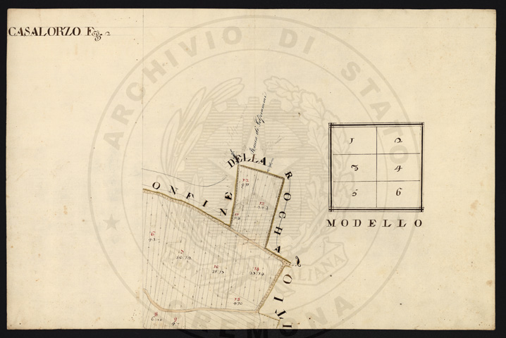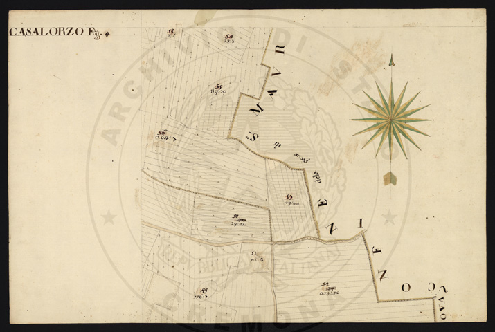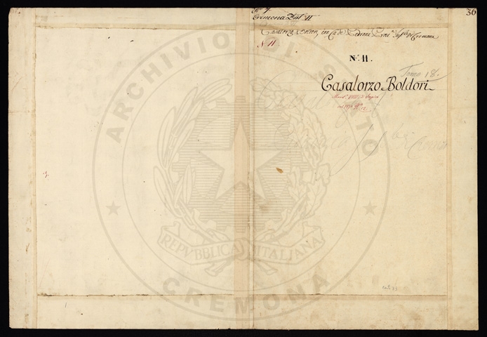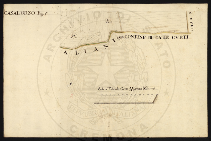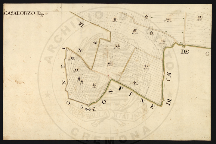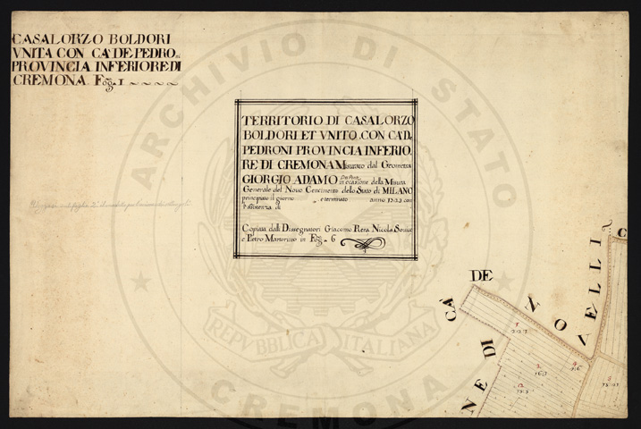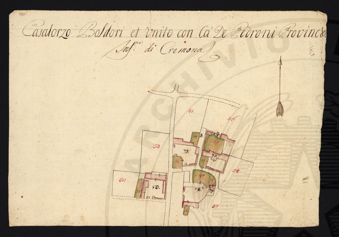 Mandamento: CremonaComune: Casalorzo BoldoriSegnatura: 033Fogli: 6Sviluppo C.U.: 1Mappetta: 1Anno: 1723Scala: Trabucchi 140 milanesiMisuratore: Giorgio Adamo DupontDisegnatore: Giacomo Rera, Nicola Sovico, Pietro Martorino