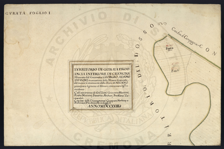 Mandamento: CremonaComune: GurataSegnatura: 017Fogli: 3Anno: 1723Scala: Trabucchi 120 milanesiMisuratore: Giorgio Adamo DupontAssistenti: Giovanni Losi, Giacomo Mazzini, Paolo Mazzini, Saverio Arcari, Stefano ZanacchiDisegnatore: Gaspare Forlicco, Francesco Picchinino