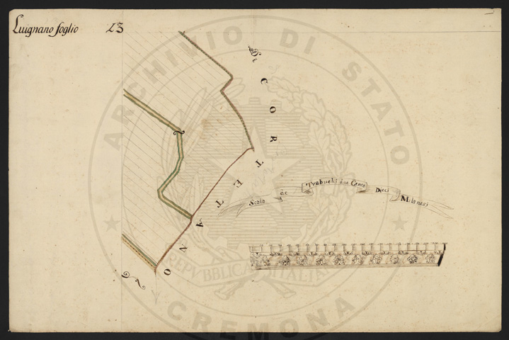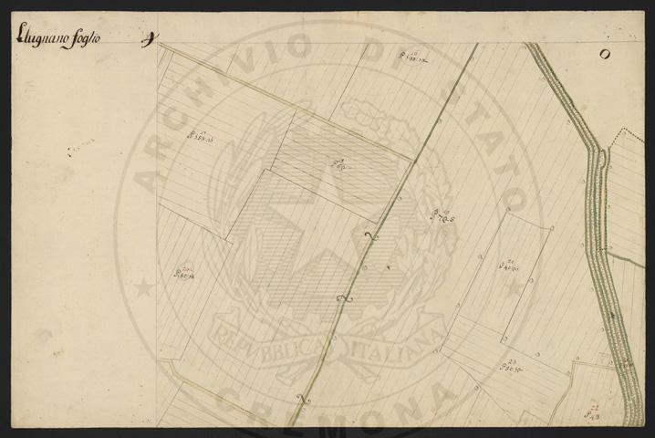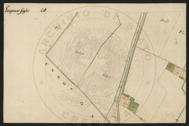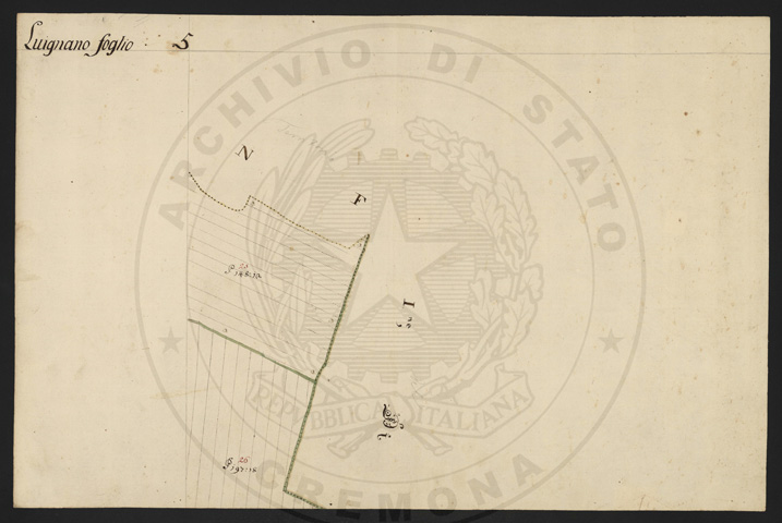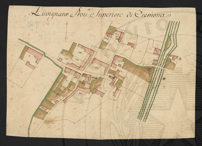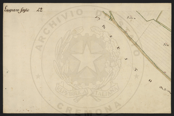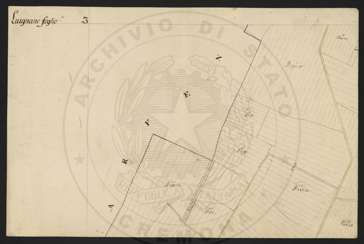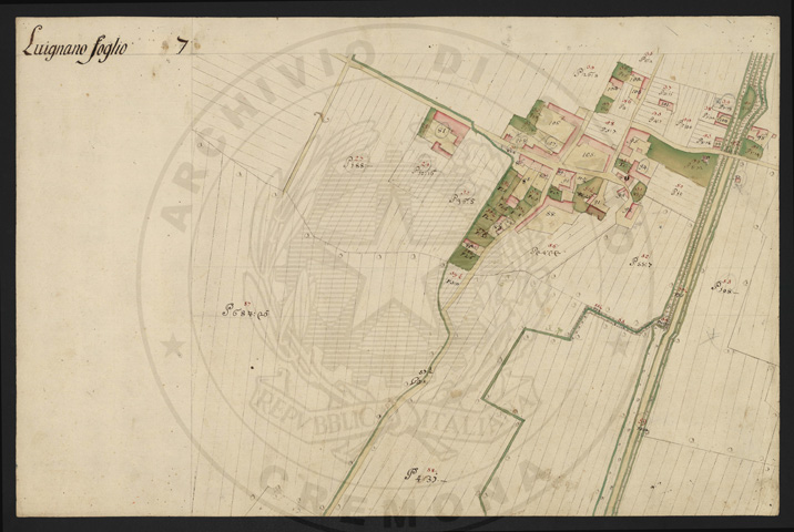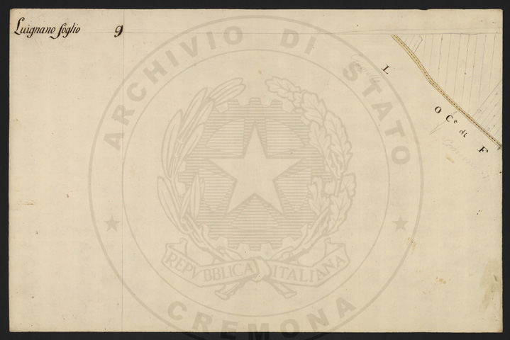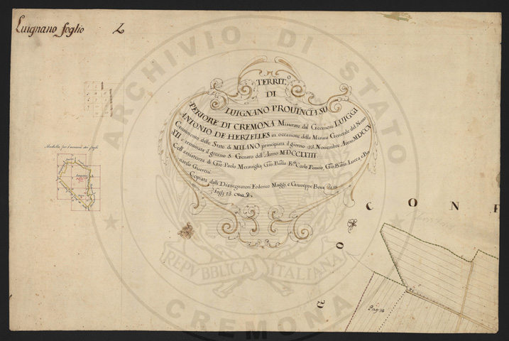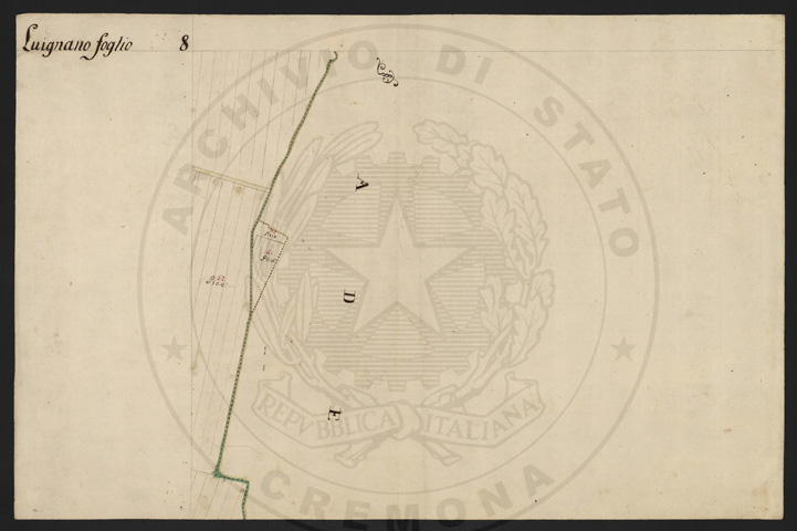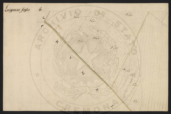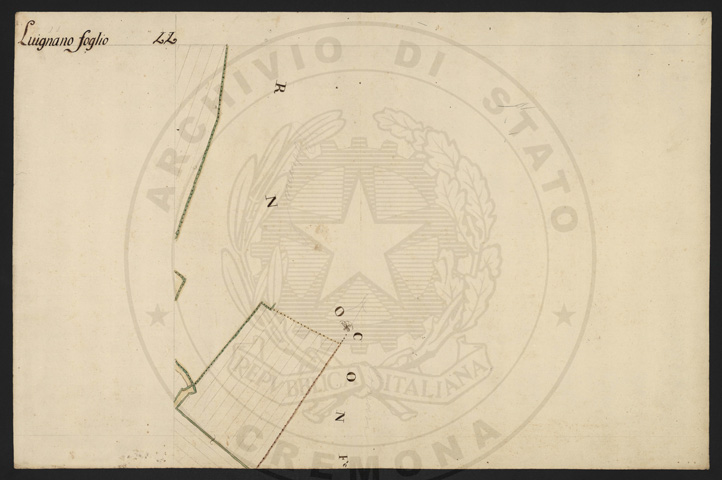 Mandamento: CremonaComune: LuignanoSegnatura: 103Fogli: 13Sviluppo C.U.: 1Mappetta: 1Anno: 1722Scala: Trabucchi 210 milanesiMisuratore: Luigi Antonio de HerzellesAssistenti: Giovanni Paolo Meraviglia, Giobatta Poncio, Giobatta Lucca, Bernardo GuereniDisegnatore: Federico Maggi, Giuseppe Bova
