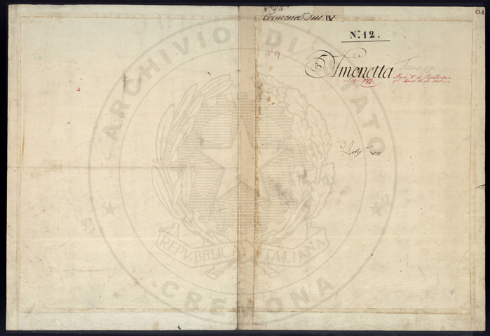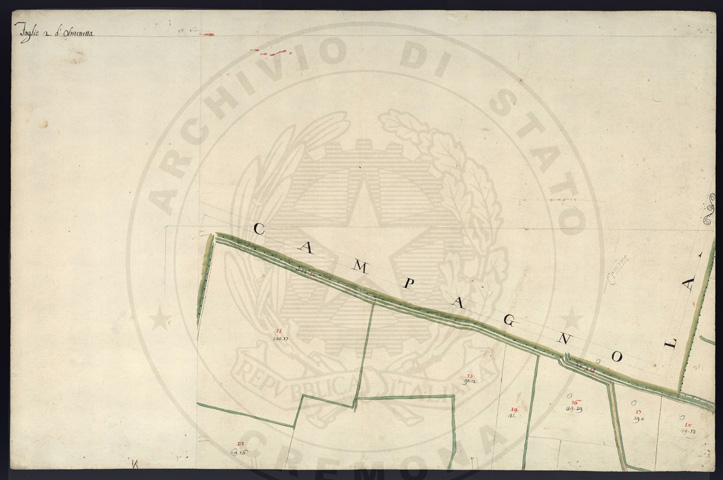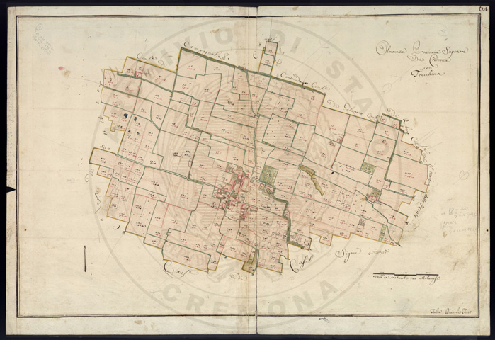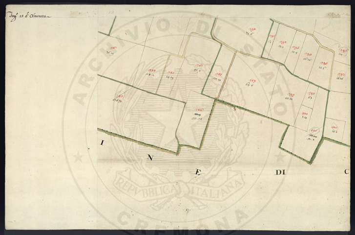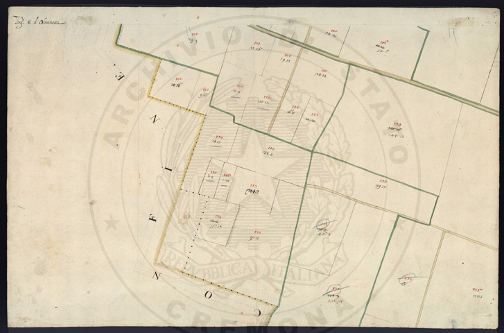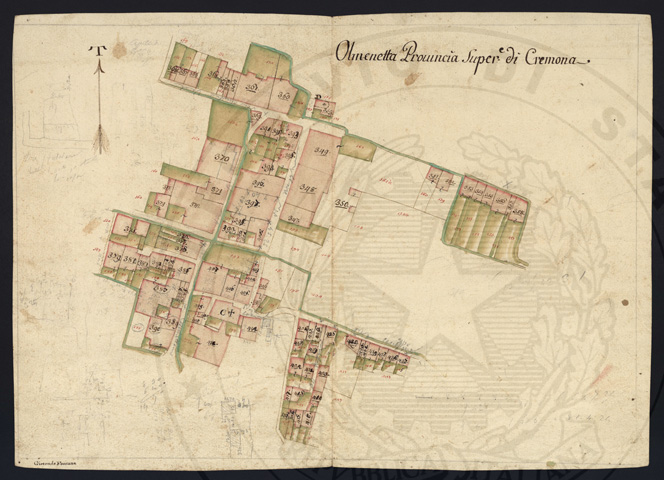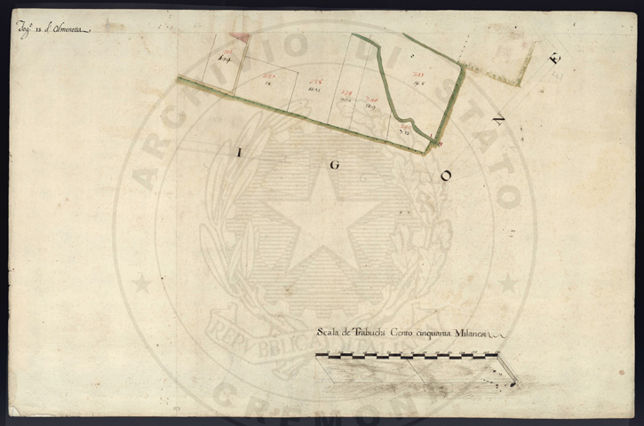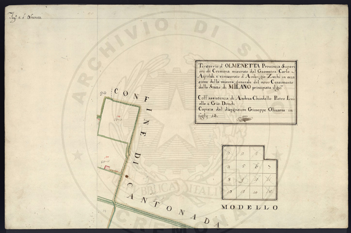Mandamento: CremonaComune: OlmenetaSegnatura: 059Fogli: 15Sviluppo C.U.: 1Mappetta: 1Anno: 1723Scala: Trabucchi 150 milanesiMisuratore: Carlo AyroldiAssistenti: Andrea Chiodello, Pietro Luiollo, Giovanni DondiDisegnatore: Giuseppe Olivares