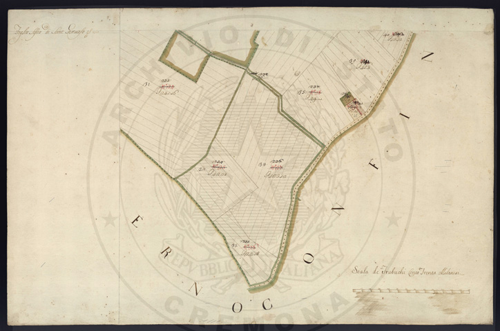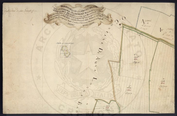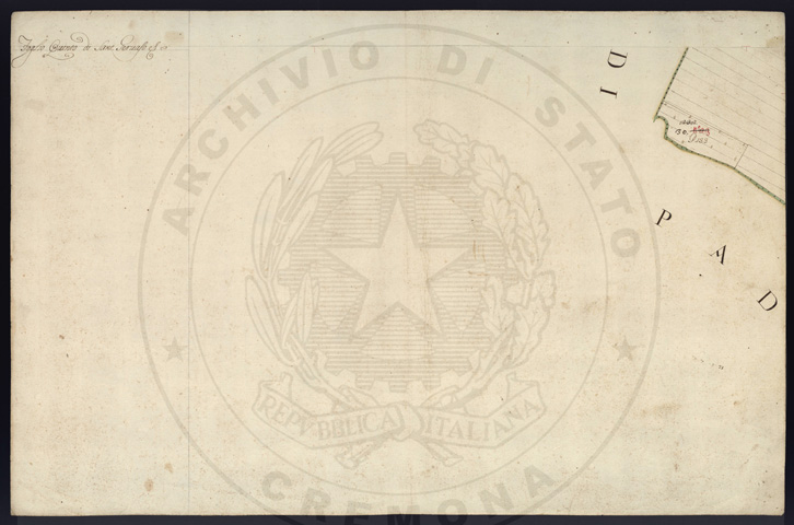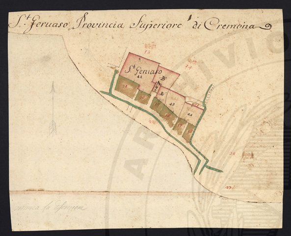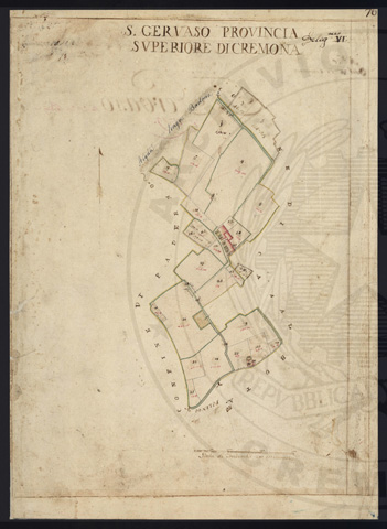 Mandamento: CremonaComune: S. GervasoSegnatura: 066Fogli: 6Sviluppo C.U.: 1Mappetta: 1Anno: 1723Scala: Trabucchi 130 milanesiMisuratore: Stefano Maria SilanoAssistenti: Giobatta Giroldi, Francesco Maria Alletto, Antonio Maria VillascoDisegnatore: Paolo Carisio, Giovanni Marinoni