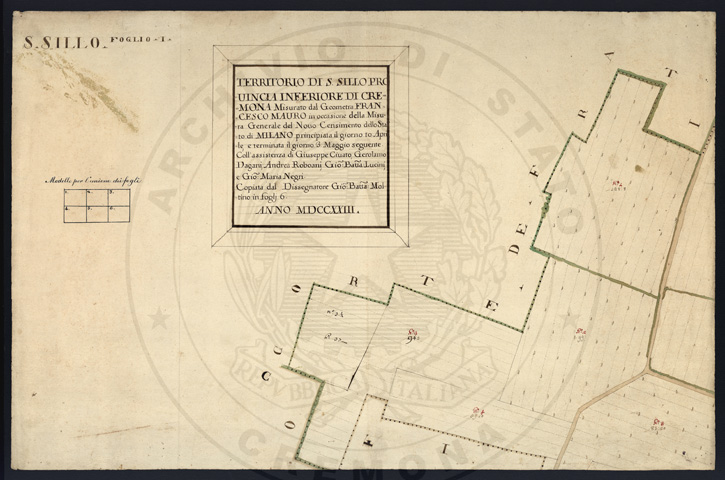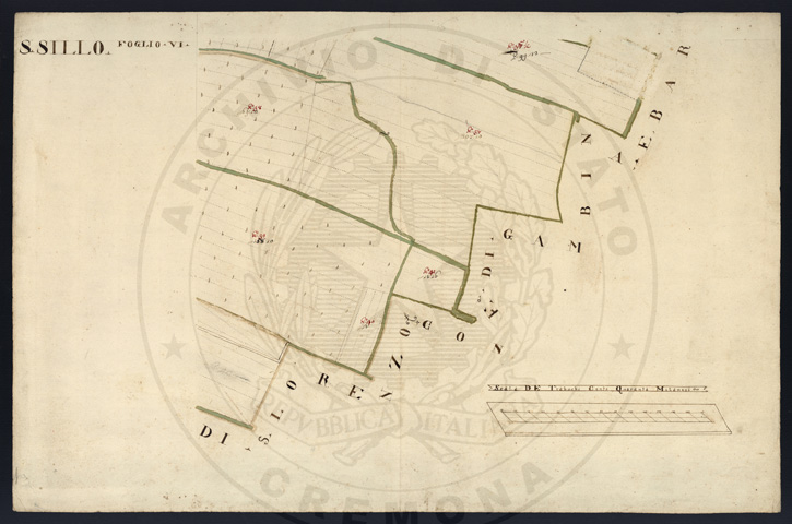 Mandamento: CremonaComune: San SiloSegnatura: 023Fogli: 6Sviluppo C.U.: 1Mappetta: 1Anno: 1723Scala: Trabucchi 140 milanesiMisuratore: Francesco MauroAssistenti: Giuseppe Civato, Gerolamo Dagani, Andrea Roboani, Giobatta Lucini, Giovanni Maria NegriDisegnatore: Giobatta Moltino