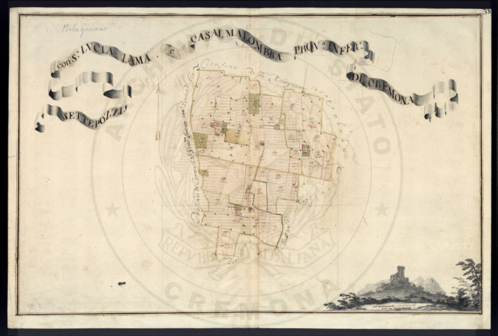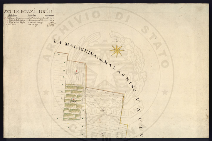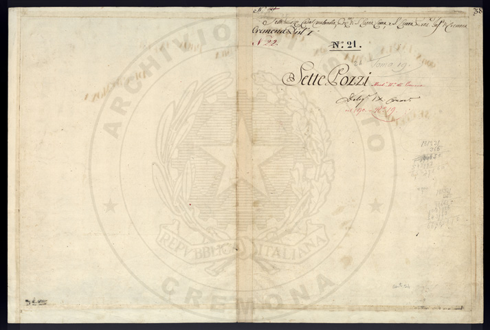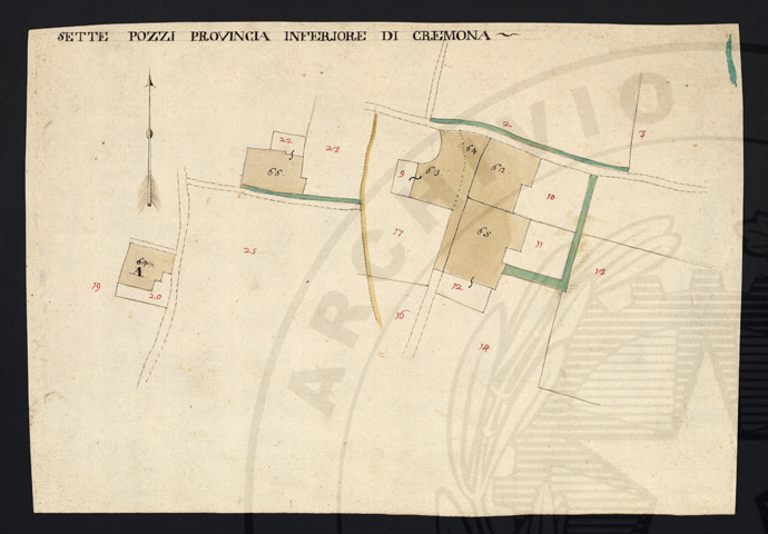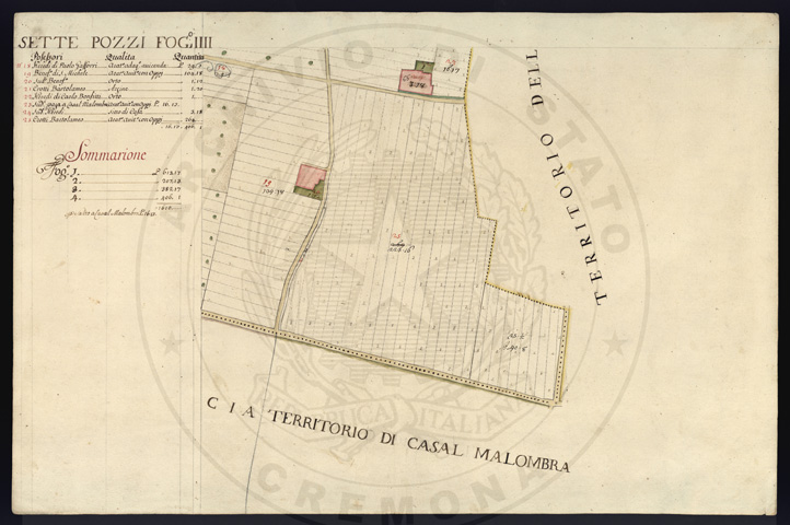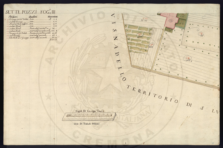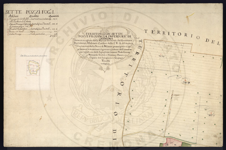 Mandamento: CremonaComune: Sette PozziSegnatura: 054Fogli: 4Sviluppo C.U.: 2Mappetta: 1Anno: 1723Scala: Trabucchi 100 milanesiMisuratore: Bartolomeo MolcianiAssistenti: Paolo Gazone, Bernardo Galleli, Vincenzo PiazziDisegnatore: Giuseppe Tavelli