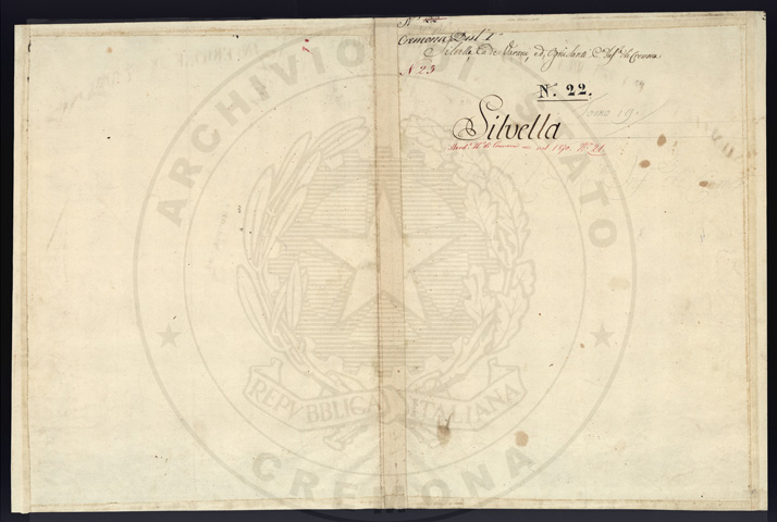 Mandamento: CremonaComune: Silvella con Ca' De' Varani e Ogni SantiSegnatura: 081Fogli: 4Sviluppo C.U.: 2Mappetta: 1Anno: 1723Misuratore: Giorgio Adamo DupontAssistenti: Francesco Bonvicini, Giobatta Longhi, Carlo Baliazi, Gian Antonio ZanorandiDisegnatore: Giuseppe Clerici