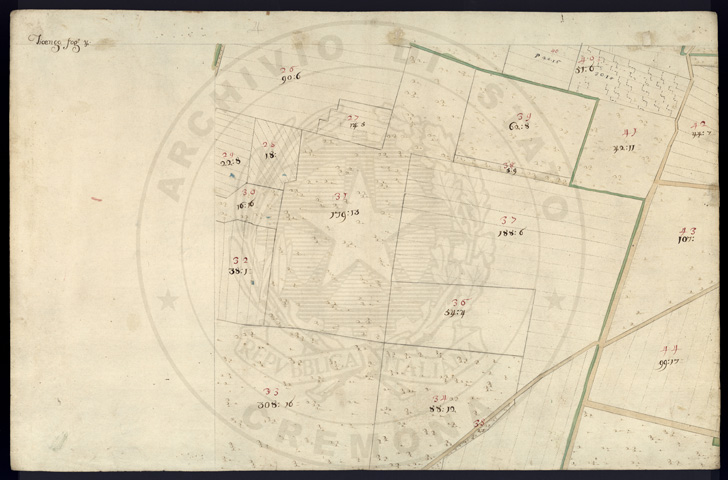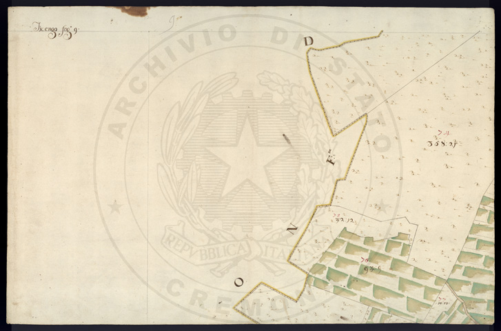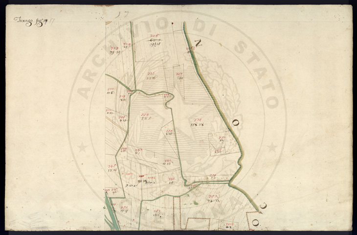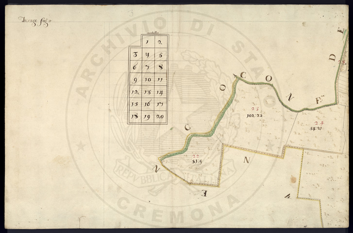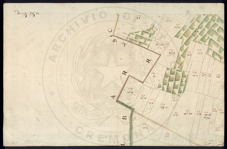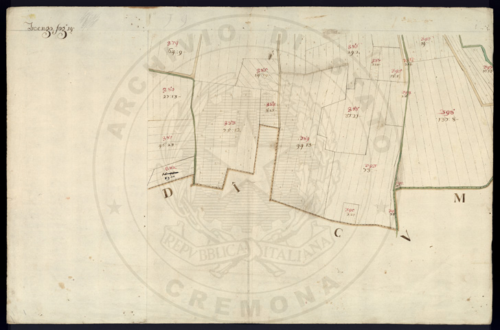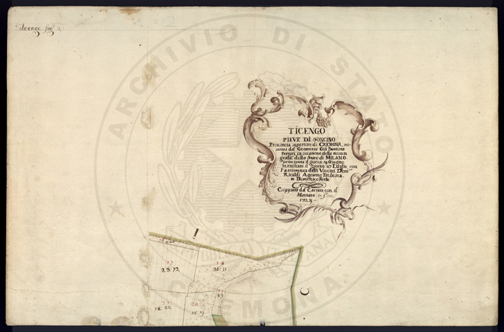 Mandamento: SoresinaComune: TicengoSegnatura: 320Fogli: 20Sviluppo C.U.: 1Mappetta: 1Anno: 1724Scala: Trabucchi 130 milanesiMisuratore: Giobatta FerrariAssistenti: Domenico Riscaldi, Agostino Trebesca, Domenico FerlaDisegnatore: Carrara, Mannate