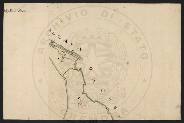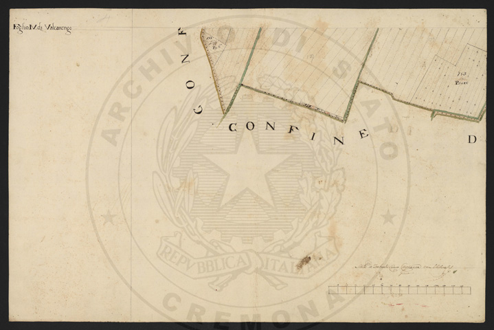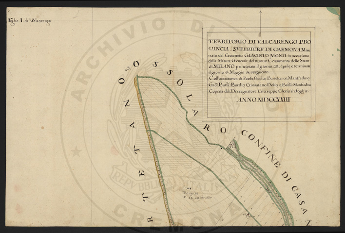 Mandamento: CremonaComune: ValcarengoSegnatura: 103Fogli: 5Anno: 1723Scala: Trabucchi 150 milanesiMisuratore: Giacinto MontiAssistenti: Paolo Beolco, Bartolomeo Manfradino, Giobatta Borello, Giosafatto Dolio, Battista ManfradinoDisegnatore: Giuseppe Clerici