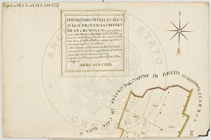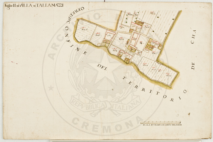 Mandamento: CasalmaggioreComune: Villa TalamazziSegnatura: 175Fogli: 2Anno: 1723Scala: Trabucchi 100 milanesiMisuratore: Giorgio Adamo Du.PontAssistenti: Francesco De Hò, Giuseppe Amadeo, Giuseppe Galletti, Domenico Generale, PietrAntonio CorbariDisegnatore: Pietro Paolo Alba