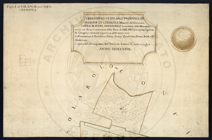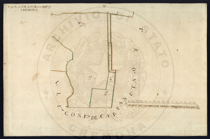Mandamento: CremonaComune: VillascaSegnatura: 010Fogli: 5Sviluppo C.U.: 1Mappetta: 1Anno: 1723Scala: Trabucchi 150 milanesiMisuratore: Carlo Matteo RezzonicoAssistenti: Bartolomeo Paliani, Andrea Zambelotti, Pietro Arildi, Francesco MaffezzoniDisegnatore: Antonio Porro, Antonio Cattella